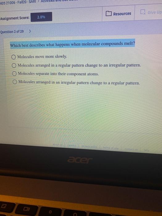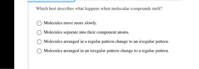 Molecules move more slowly and pack tightly together. 1 Which best describes what happens when molecular compounds melt. Molecules arringed in regular pattern change tO an irregular pattern Molecules separate into their component atoms Molecules arranged irregular pattern change t0 rcgular pattern C.
